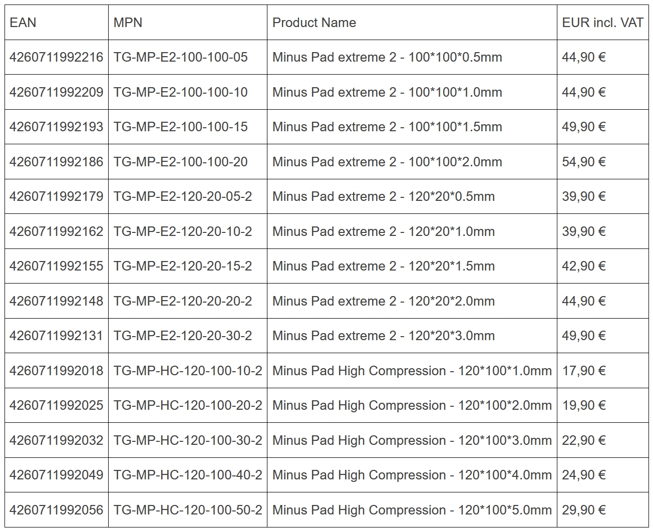 Minus Pad extreme 2 is available in sizes 120 × 20 mm and 100 × 100 mm, and thicknesses of 0.5 mm, 1 mm, 1.5 mm, 2 mm, and 3 mm (120 x 20 mm only).