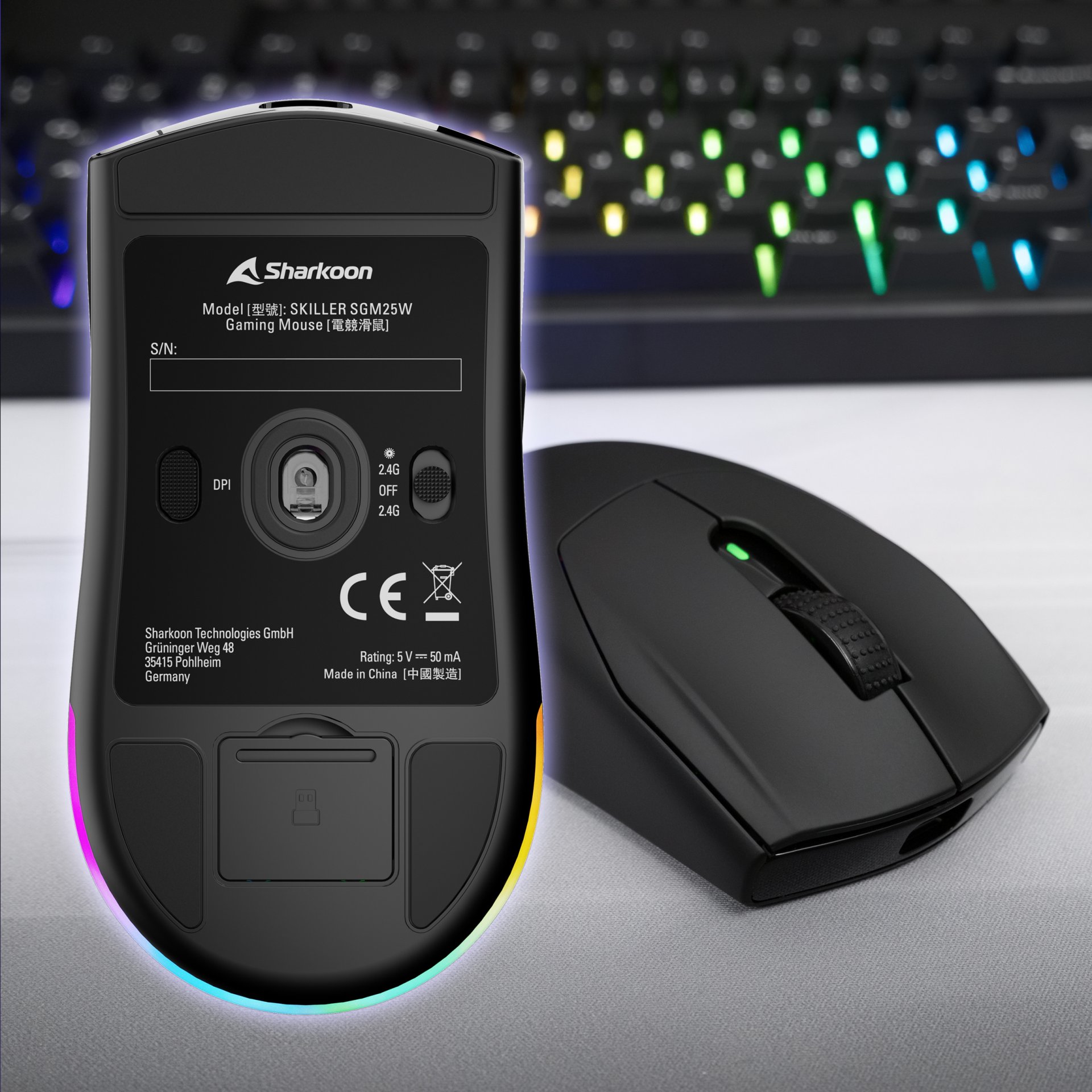 The black design of the Skiller SGM25W is a classic among gaming mice and blends in particularly well with dark or high-contrast setups.